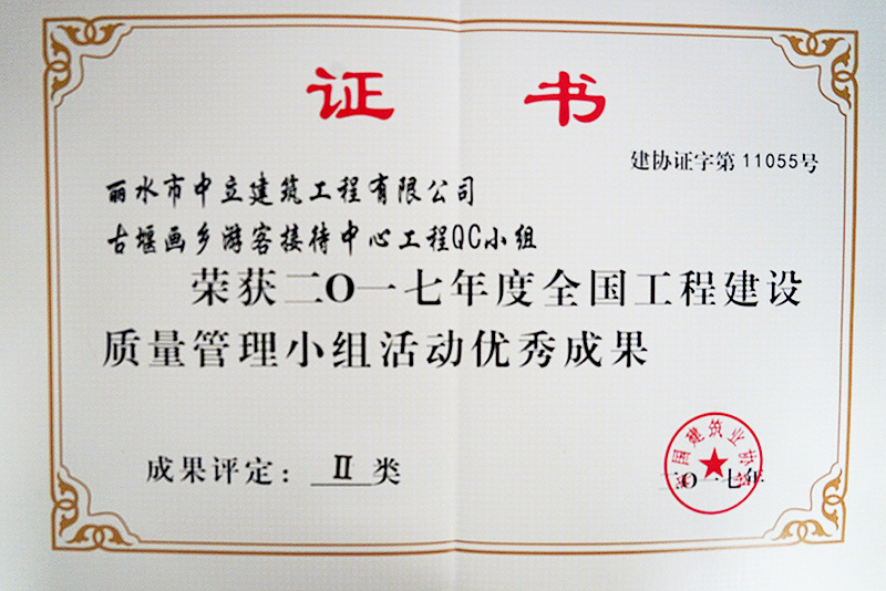 中國建筑業(yè)協(xié)會于2017年6月30日至7月4日在四川省成都市舉行2017年度全國工程建設(shè)優(yōu)秀質(zhì)量管理小組發(fā)布會,我公司古堰畫鄉(xiāng)游客接待中心工程QC小組的活動(dòng)課題:“提高夯土墻飾面層質(zhì)量合格率”被評為2017年全國工程建設(shè)優(yōu)秀質(zhì)量管理小組二等獎(jiǎng)。